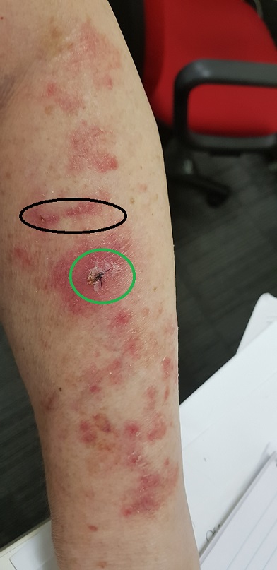 Why is this happening? The medication I was on, my second inflammatory arthritis medication, was GREAT for the arthritis. However, it is considered not so great for my skin. This is my left arm a couple of days after the biopsies. This is the worst patch, always has been the problem area. Ignore the scar circled in black – that was the result of having a run-in, literally, with a broken fire extinguisher. The area circled in green is one of the biopsy sites.