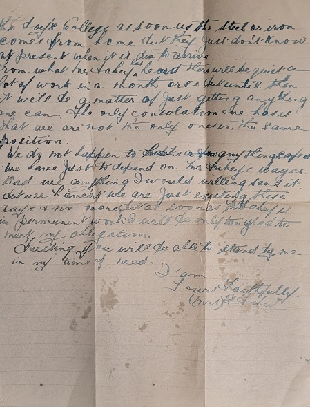The letter ends with “love and kisses to my wee pet”. By this time Irene had married and was Mrs Fahey. The letter seems to imply Irene may have been paying for my father to be cared for, but I have no confirmation of that. The cheque she mentions may have been a contribution, rather than payment of a fee.