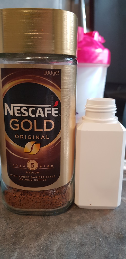 How big is the pill bottle compared with a standard household object? Here it is compared to a coffee jar.
