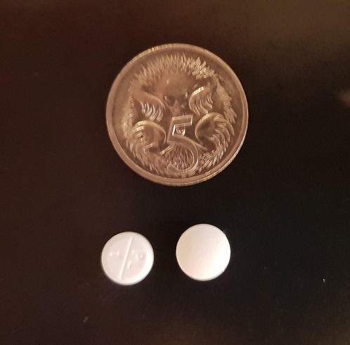 Not much difference in size, is there? The tablet on the left is from the little bottle, the one on the right is from the big bottle. But you can’t tell how big the tablets actually are, you say? I thought of that. So here they are below with a five cent piece for scale.